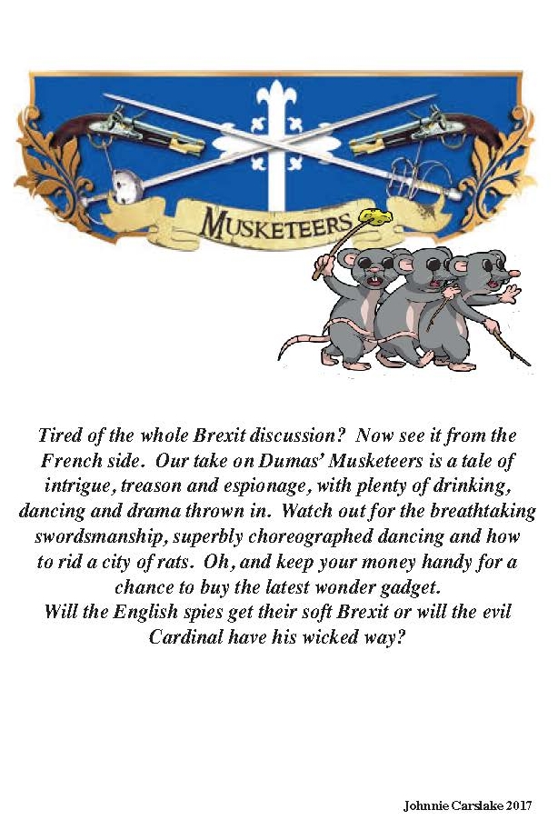 The Musketeers are ordered by their commander (Pam Warwick-Baker) to save the Queen's honour (Rosemary Gibson's) and reclaim her valuable necklace, a gift from the King via the machinations of the cardinal Richelieu, which she has foolishly parted with while in the Duke's Arms. No, not the pub on the corner, but those of her English (spit) beau. But do we believe that they can achieve their task? (Oh yes we don't!).