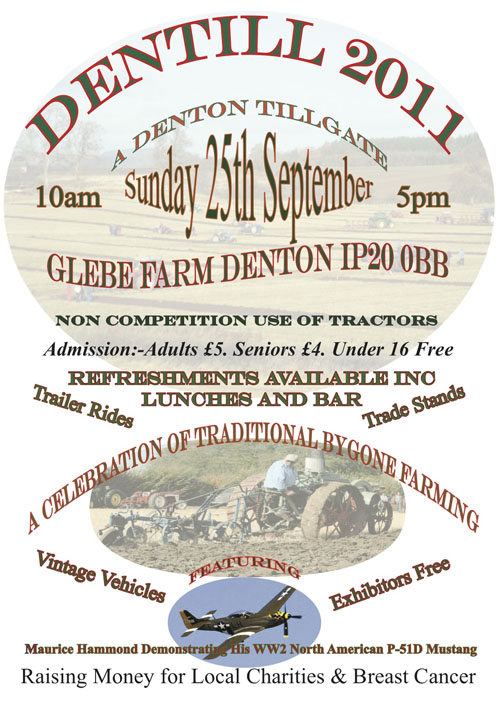 The event, attended by more than 700 people, was a great success. Over 60 tractors, old and new were on display, many of them in action. The traction engine powered threshing display was a great attraction. Other attractions included a display of vintage cars, a pets' corner, a sandpit and donkey rides for the children and excellent food and drink facilities. Local cyder produced by Denton's Blackhand Cyder Society proved to be very popular. All the money raised went to charity.